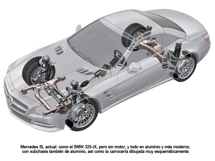 Por el contrario, el tema de los silent-blocs que se interponen entre los brazos y tirantes de la suspensión y el monocasco, junto con la eventual interposición de algún sub-chasis que a su vez lleva otros entre él y la carrocería, es actualmente la piedra filosofal para luchar contra el NVH, dando ya como fijas la rigidez estructural, la aerodinámica de la carrocería y el equipamiento de llantas y neumáticos. Con esto cerramos el círculo, y volvemos a los dos coches que han sido el motivo de que esté escribiendo esta entrada: el Mercedes SL y el Infiniti M-35h. Aunque, bien pensado, hay un tercer coche que me viene a la memoria y también tiene, o mejor dicho tuvo, bastante que decir respecto a todo esto; y empezaremos con él, para luego rematar con los actuales.