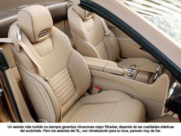 Y finalmente tenemos la rodadura; que incluso a coche nuevo, y aunque todo lo demás funcione perfectamente, es lo que más distingue a unos coches de otros, respecto al asunto que nos ocupa. El origen está siempre en el impacto del neumático con las desigualdades, grandes o pequeñas, del pavimento; y luego el sonido, y sobre todo el impacto y las vibraciones, se transmiten al monocasco a través de llanta, rodamiento, portabujes, brazos de suspensión, silent-blocs, posibles sub-chasis y la fijación de éstos al monocasco, último receptor estructural de los impactos. Al final, al margen del aislamiento acústico del habitáculo, está el filtrado que realiza el acolchado de los asientos, ya que el auténtico último receptor de los impactos, y el que realmente nos interesa, es el ocupante del vehículo.