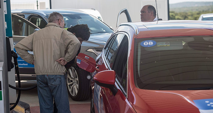 Y aquí el repostaje final de nuestro coche, que coge lo suyo de tiempo, ya que entran 14 litros desde que la pistola de la manguera dispara por primera vez. Un servidor, de espaldas, vigila la maniobra para que no se caiga fuera ni una gota.