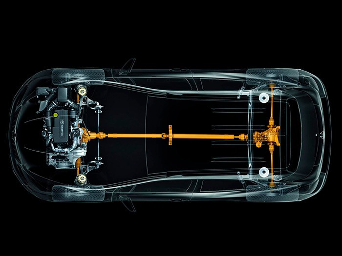 Radiografía de la tracción integral, con el embrague situado por delante del diferencial trasero. Debido a ello, el eje torsional no puede llevar guiaje transversal por tirantería de Watt, como en los Astra.