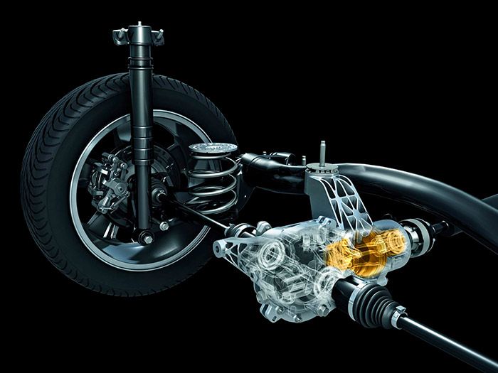 La tracción total es de lo más sencillo: el embrague trasero, de gestión electrónica, la hace variar de 100/0% en seco a marcha estabilizada a 50/50% en piso muy deslizante, con diferenciales abiertos (o sea, sin efecto autoblocante) en ambos trenes. El sistema de Ford, a base de dos embragues, uno a cada lado de la salida del diferencial trasero es más voluminoso, pesado y costoso, pero permite introducir un efecto autoblocante o simplemente de lo que se ha dado en llamar Torque Vectoring, pasando más par a la rueda exterior en curva.