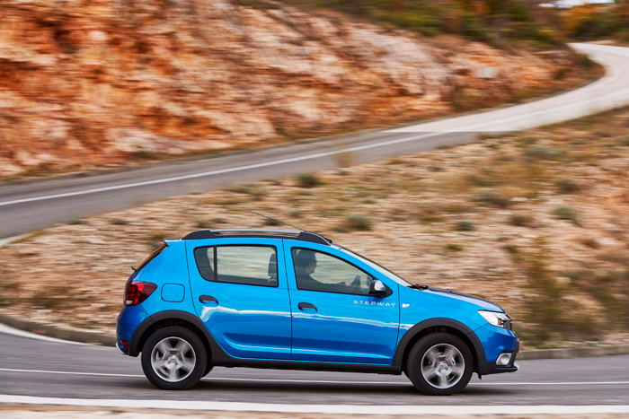 La vista lateral identifica tres de las diferencias respecto a un Sandero normal de mecánica similar: suspensión elevada, barras en el techo, y aletines negros en los pasos de rueda. Además, las placas en la zona inferior frontal y posterior, y la parrilla específica.