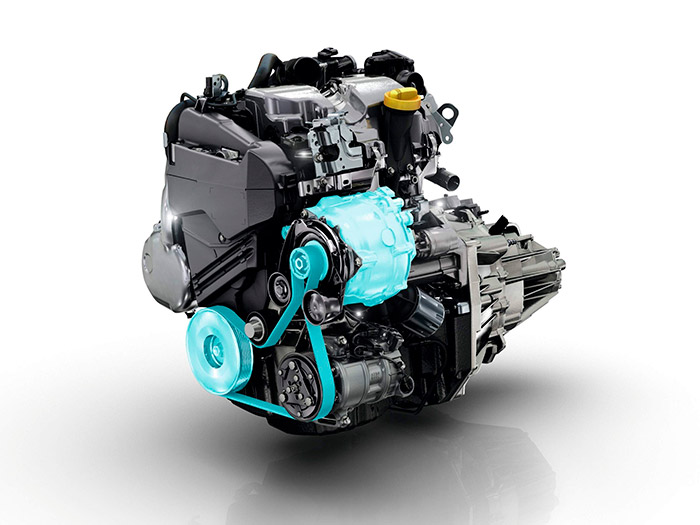 La diferencia es que el sistema de Renault colabora aportando energía directamente a la impulsión del vehículo, y no se conforma con optimizar la generación de energía eléctrica para los múltiples consumos de un vehículo moderno. La clave es que monta un motor/alternador (esto no es novedad en sí mismo) conectado a una batería de 48 V, para rebajar el amperaje que circule por el cableado. Este aparato eléctrico va conectado a la polea del cigüeñal mediante una correa trapezoidal muy fuerte, ya que no sólo genera energía en las retenciones y frenadas, sino que aporta impulsión, a través de la citada correa, a la polea del cigüeñal.