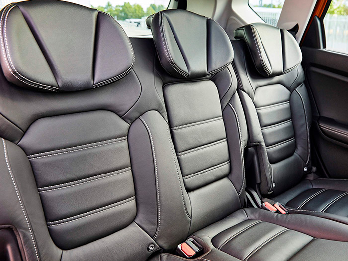 Lujosos asientos delanteros de cuero, en los que destacan los reposacabezas con aletas laterales en ángulo; detalles que agradecerá sobre todo el pasajero, ya que permiten reclinar la cabeza para intentar (no siempre se consigue) descabezar un sueñecito.