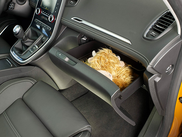 También en el Scénic se aplica la excelente idea Renault de que la guantera sea deslizante y no abisagrada. De este modo el contenido no se amonta hacia delante o detrás al abrir y cerrar, y es más fácil buscarlo.