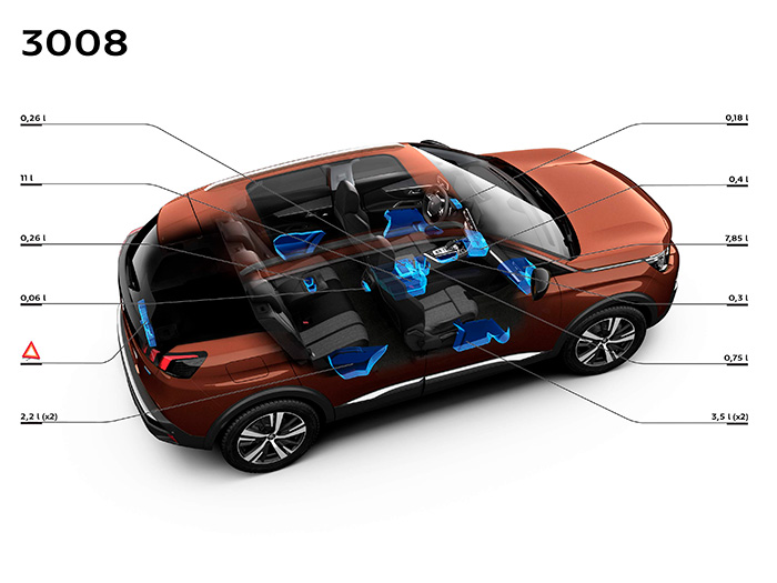 Localización y capacidades de los doce huecos del habitáculo en los que se pueden introducir los más variados tipos de impedimenta.
