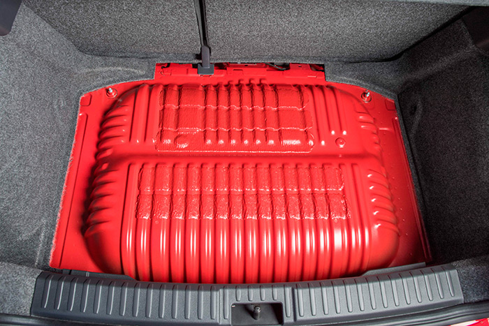 Esta carcasa, situada a su vez bajo la plancha del piso del maletero, separa la zona de transporte de equipajes de la correspondiente a las dos bombonas que contienen el gas natural comprimido.