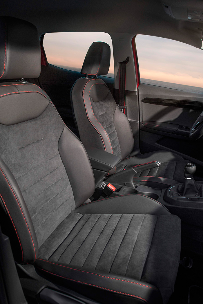 Asientos delanteros de Alcantara y cuero pespunteado en rojo, en el acabado FR; el detalle también incluye el pomo de la palanca del freno de mano.