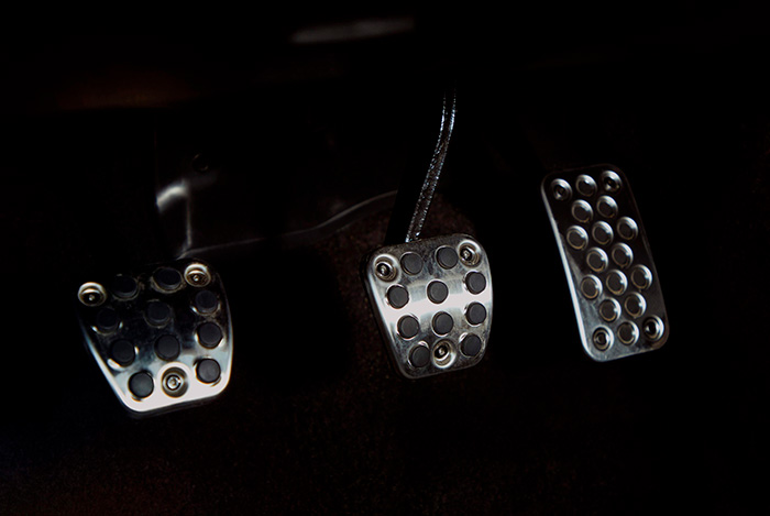 Uno más de los refinados detalles de Honda: los pedales de freno y embrague -en los que sería peligroso que la suela del zapato se resbalase- disponen de resaltes de goma (o plástico similar); por el contrario el del acelerador, donde interesa que el pie pueda deslizar suavemente para dosificar la exigencia de par, los orificios circulares están hundidos, y el zapato hace contacto directamente con el metal.