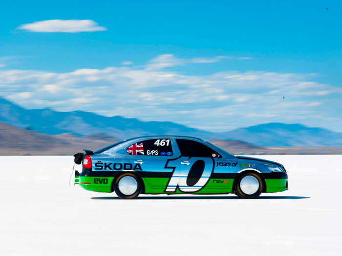 De modo que pidieron un hueco en las jornadas de Bonneville, y para allá que se fueron con su Octavia RS Special. Con el británico Richard Meaden al volante, el objetivo se resistió no una, sino cinco veces, pero finalmente, el 15 de Agosto cayó y quedó fijado en 325 km/h. Pero a la vista del éxito se pensó en atacar el récord mundial, y al cabo de una semana y en la fecha antes señalada, el nuevo récord quedó establecido en la velocidad también antes indicada. La pista del Lago Salado, con una zona especialmente allanada de cinco kilómetros, había dictado sentencia. Gran regocijo de todos los participantes, y la clásica foto de todos junto al coche; foto que no hemos incluido, pues ninguno de ellos es conocido.