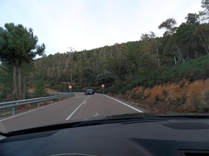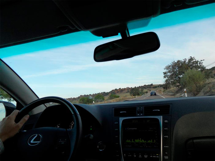 “Despacio que llevo prisa”. Con un coche más potente no cuesta seguirle el ritmo a Arturo y es un verdadero placer verle trazar curvas con tiralíneas. Para una mejor eficiencia con el híbrido, a la salida de las curvas en subida se aplica una fuerte aceleración instantánea tirando de batería, recargándola después a medio gas, llaneando y tratando de no apagar el motor de combustión. Frenos usados en modo regeneración siempre que resultase posible (casi siempre). Durante la ruta y aplicando este estilo de conducción, conseguí saturar la carga de la batería en una ocasión, disponiendo además de trato preferencial eléctrico en tres o cuatro ocasiones más. Excepto en la circunvalación de Talavera, en toda la prueba creo que no llegué a bajar más de una raya la carga estándar de la batería (lástima no disponer de impulsión eléctrica asistida por “GPS” o por “mi mano”, como en algún otro modelo híbrido de la competencia).