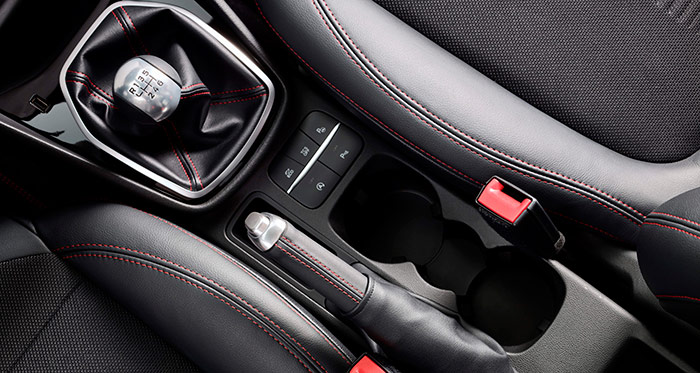 En la consola horizontal se acumulan, de delante hacia atrás, nada menos que todos los siguientes elementos: un jack electrónico, una toma de corriente 12V, el cambio de marchas, las cinco teclas de programa Eco, anulador del control de tracción, dirección para parking, anulador del Stop-Start y avisador de grúa/robo, más el freno de mano, las dos hebillas de los cinturones delanteros, dos posavasos y un pequeño hueco entre ellos, y otro jack electrónico. Casi tantos como en el techo de la cabina de pilotaje de un Jumbo.