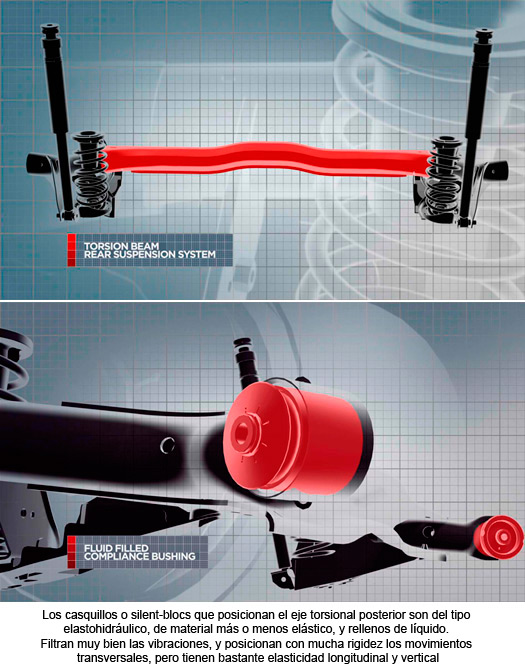 Pasando a los aspectos dinámicos, ambos trenes de suspensión van conectados al monocasco por intermedio de sendos subchasis de chapa; pero lo realmente importante es la profunda revisión a la que ha sido sometido el eje torsional trasero, gracias a lo cual el comportamiento rutero se ha transfigurado por completo. De entrada, el eje en sí es mucho más robusto, y es más rígido de lo que lo era en la versión Type-R de la generación anterior. Pero además, su fijación al subchasis es a través de unos nuevos casquillos o silent-blocs elastohidráulicos, que filtran mucho mejor las vibraciones pero ofrecen una gran rigidez transversal, por lo que el guiado del eje es mucho más exacto que antes. Un detalle más que subraya la atención que se ha puesto para optimizar el comportamiento del tren posterior es que la orientación de la hélice de los muelles es la opuesta a uno y otro lado para que sea simétrica, de modo que al subir y bajar, ya sea en aceleración, frenada, variaciones de carga u ondulaciones en la carretera, no se produzca el menor efecto de tiro lateral.
