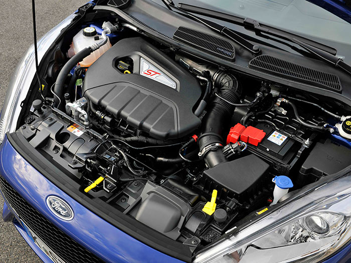 Volvamos a nuestro Fiesta ST, y empecemos por lo primero: el motor. Aunque esté bajo el paraguas de la común denominación EcoBoost, no es de la misma familia tecnológica que el asombroso 1.0 tricilíndrico de 125 CV; es un poco más antiguo, si bien con detalles muy de actualidad como la inyección directa y la bomba de aceite de caudal variable. Va muy bien, pero más o menos en el mismo nivel que sus rivales directos; y no es una versión de motor especialmente afinada para un coche de carácter muy deportivo, ya que sus datos de rendimiento son exactamente los mismos que cuando va montado en el Focus. Y este Focus es un turismo muy brillante (su prueba ya salió en este blog), pero no radical; el ST del Focus lleva un motor 2.0 de 250 CV, que son 125 CV/litro, mientras que el 1.6 se queda en 114 CV/l, que no está mal, pero no es lo mismo.