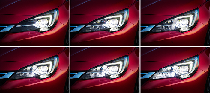 Secuencia de cómo van aumentando los elementos LED que se encienden en los faros IntelliLux de Opel. Es complicado, pero el resultado es impecable; mientras la fiabilidad también lo sea, la solución es óptima.