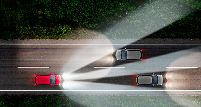 Este es el esquema de cómo el IntelliLux consigue seguir a un coche y cruzarse con otro sin deslumbrar a ninguno, manteniendo a su vez una iluminación de mayor alcance que el clásico haz de cruce asimétrico.