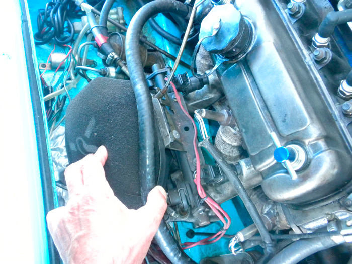 El motor por el lado de los colectores: en el de admisión podemos ver los inyectores, unos cacharritos negros en los que conectan los cables de color rojo que traen la señal desde la centralita; y en cuanto a los cables blancos, van a los sensores roscados en el colector de escape (bajo material aislante, para proteger a mecánica y habitáculo del calor), a fin de poder regular la riqueza de la mezcla cuando se conecta el ordenador portátil a la centralita.