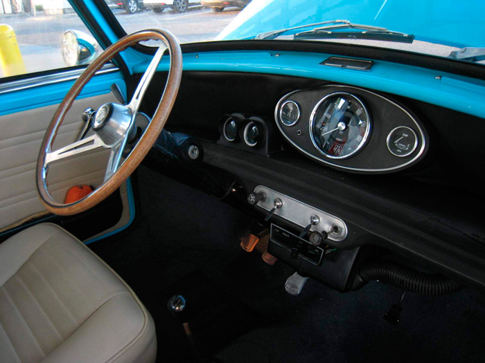 El clásico interior, apenas modificado (en apariencia): el velocímetro y el cuenta-km no van por cable mecánico, sino por señal GPS, aunque su apariencia es la clásica; y luego tenemos un pequeño cuenta-rpm (no muy práctico) y un indicador instantáneo de la riqueza de mezcla. Por abajo asoma el pedal de acelerador suplementado (origen Paddy Hopkirk), y la palanca de cambios (dura de manejar) ya es la vertical, y no la “varita mágica de hada” en diagonal que llevaban los modelos más antiguos. En cuanto al volante, todavía es de madera, puesto que el de cuero todavía no estaba de moda en los años iniciales del Mini (aunque sí más tarde).