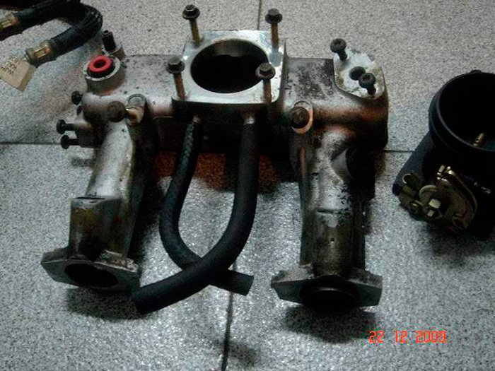 El colector de admisión (antes de limpiarlo); a la derecha aparece parcialmente la caja de la mariposa. Se aprecian los alojamientos donde se roscarán los inyectores, apuntando al interior de la culata.