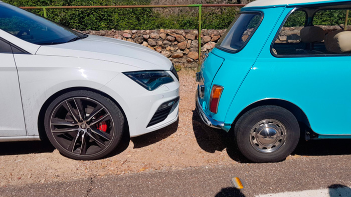 Lo que supone una diferencia de 58 años entre las fechas de diseño del coche de prueba y del “escolta”: el Mini calza una 145/80-10, mientras que el León Cupra, nada menos que una 235/35-19. El diámetro de llanta es casi el doble, aunque la altura de la sección es casi cuatro centímetros mayor en la rueda pequeña, con flancos más flexibles y, por lo tanto, más cómoda. Salvo al cruzar obstáculos bruscos, tipo “guardia dormido”, ya que el diámetro total de la rueda del Seat es 19 cm mayor.