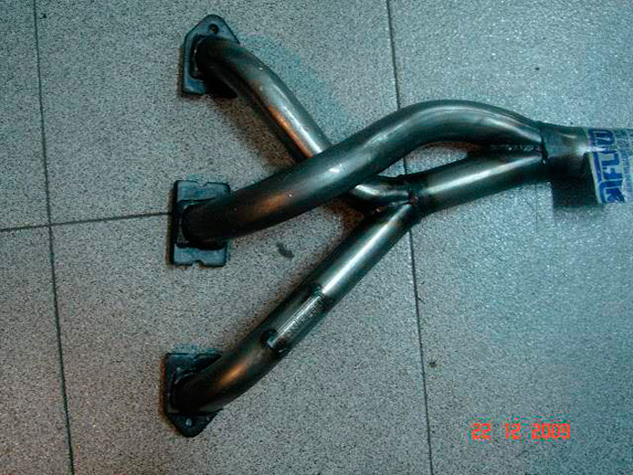 El colector de escape, recién llegado de Gran Bretaña, todavía con algún papel del embalaje. Todavía no se le han adaptado las tomas para verificar los gases de escape, necesarias para afinar la dosificación de la centralita.