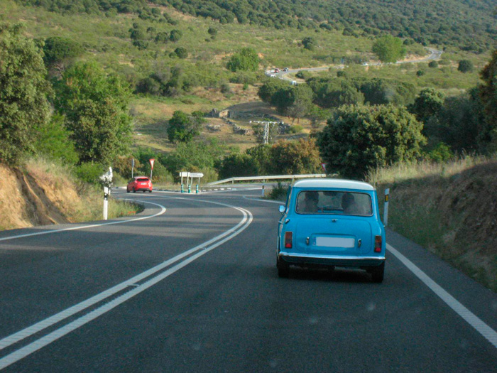 El Mini es pequeñito, pero lo parece todavía más frente al imponente paisaje de la Sierra de Guadalupe. Una carretera comarcal en buen estado parece casi del trazado Redia, si utilizamos al Mini como base de comparación.