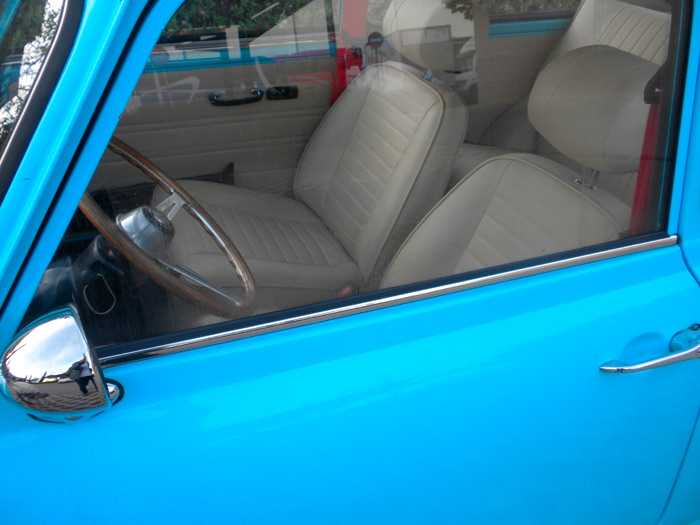 Aquí tenemos una buena perspectiva de los asientos delanteros, que son de origen Authi Mini-Cooper 1300. Uno de los pocos detalles en los que el coche fabricado en España mejoraba en algo a los británicos.