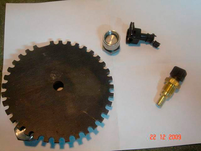La rueda dentada (con un hueco) y el sensor que sirven para captar la posición del árbol de levas, a fin de que la centralita ajuste el avance de encendido.