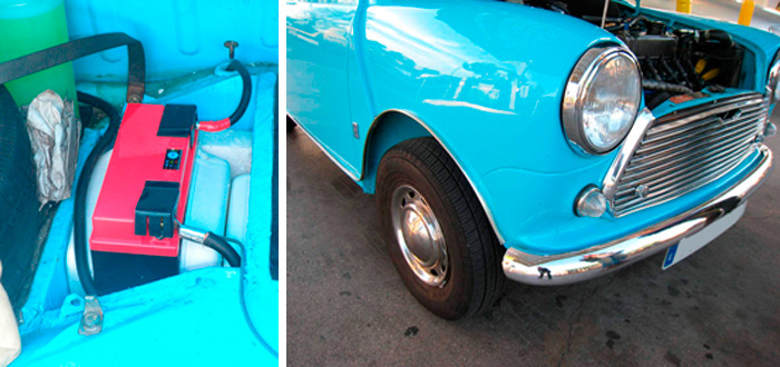 Y tengo que alabar el buen gusto del dueño del Mini, ya no me acordaba que pinta tienen cuando no les ponen aletínes y minilítes en 13″. La elección mecánica también me parece buenísima, aunque me quedo con la curiosidad acerca de la cilindrada. ¿Porqué 1000, y no un bloque 1275 con una preparación equivalente? Seguro que hay una razón y me gustaría conocerla.