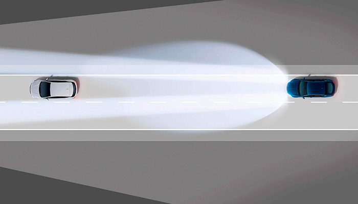 Otra de las “habilidades” del IntelliLux en carretera convencional: al seguir, o más bien alcanzar a otro vehículo, mantiene algunos proyectores de “largas”, pero formando una cuña que ilumina por ambos lados de dicho coche, pero sin deslumbrarle por el retrovisor. De este modo se siguen controlando a distancia tanto la cuneta derecha como el carril contrario izquierdo.