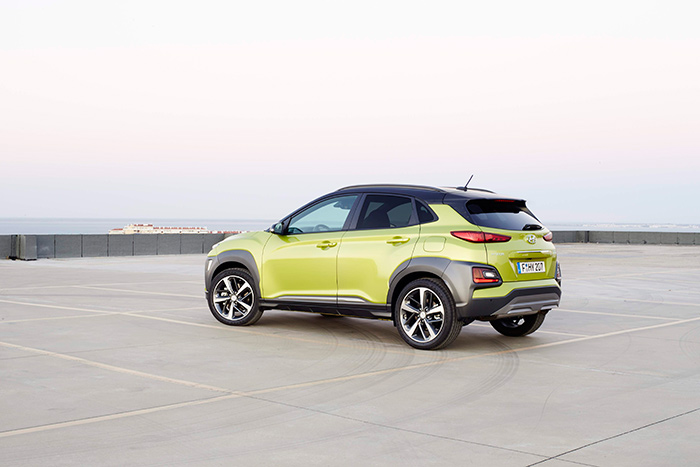 El diseño del Kona no llega a ser tan duro como el habitual de un SUV: el capó tiene forma de trompa en suave caída de su mitad delantera, y el parabrisas está muy tumbado. Contrastan las amplias protecciones de la carrocería en el lateral con la nula existente para el frontal.