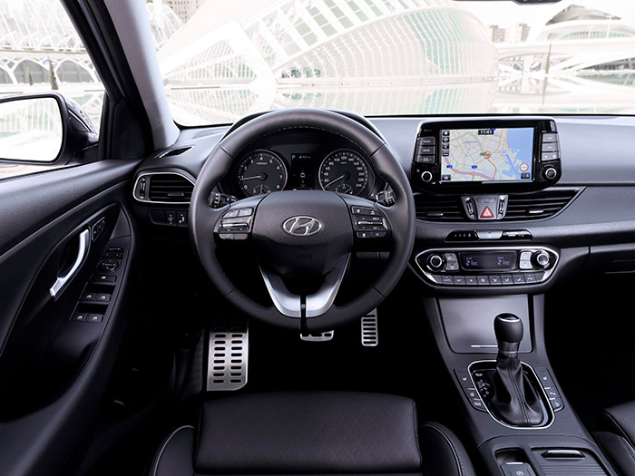 En el interior, el Fastback sigue siendo un i30 (sólo que en esta foto con cambio DCT, y no manual), con su pantalla principal muy bien situada en alto, a costa de romper la armonía de diseño del salpicadero.