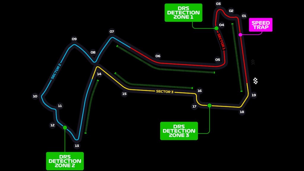 El Marina Bay Street Circuit es lo más parecido a Mónaco del calendario. Un trazado estrecho, con muros y sin rectas largas. Desde su última actualización en 2023, el tercer sector del circuito es más rápido, ya que se retiró la zona del túnel por una recta con DRS. Sin embargo, sigue siendo un lugar complicado para adelantar.