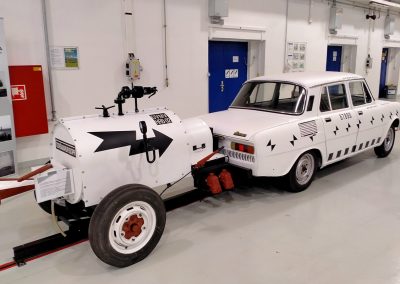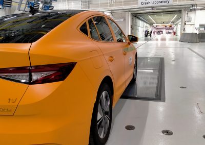 Gran parte de los 180 metros del edificio principal se utilizan para acelerar el vehículo, enganchado a un cable de acero encarrilado por debajo del piso, que impactará contra otro coche u otro obstáculo. Que sea tan largo es importante, según Škoda, para que la aceleración sea suave y los dummies no se muevan antes del impacto. Bajo el suelo de esa nave principal hay una planta subterránea donde está la maquinaria eléctrica que, a modo de tirachinas gigante, puede acelerar un vehículo hasta 120 km/h, o dos en dirección contraria hasta 65 kilómetros por hora (siempre que pesen menos de 3,5 toneladas en total) en el caso de impactos frontales.