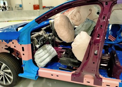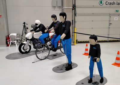 Para simular cabezas, hay una especie de esferas (de distintos tamaños y pesos; adultos y niños) con acelerómetros que determinan la fuerza del impacto sobre el capó o la luna. Para verificar el funcionamiento de las cámaras, radares y sensores ultrasónicos que sirven para evitar accidentes por alcance y atropellos, también hay coches inflables y maniquís. Para comprobar el aislamiento y estanqueidad de las baterías y los componentes de alta tensión de los coches eléctricos, hay una especie de cuba donde se sumergen los vehículos.