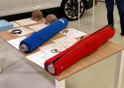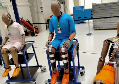Esa sensación de laboratorio se ve reforzada por el instrumental que se ve alrededor: maniquíes de ensayo (conductores, peatones y ciclistas), esferas que simulan cabezas, piezas alargadas recubiertas de espuma a modo de piernas, coches desprovistos de guarnecidos y con los airbags desplegados, carretillas de impacto, coches inflables, sillas infantiles, guardarraíles, instrumental de diverso tipo, etc.