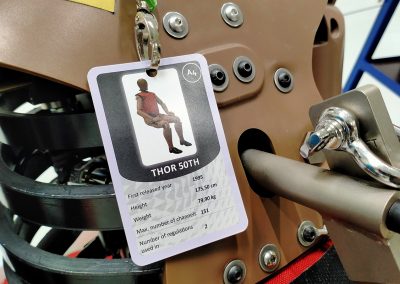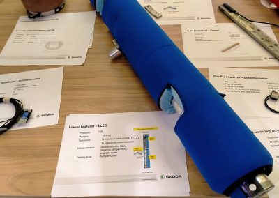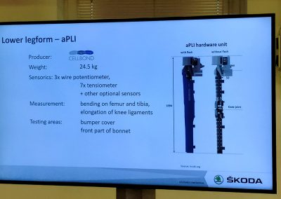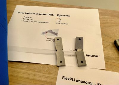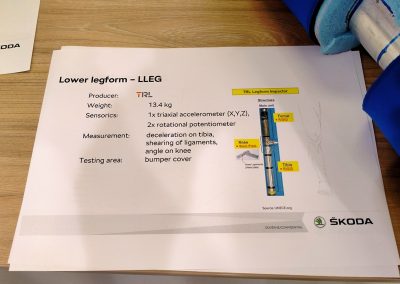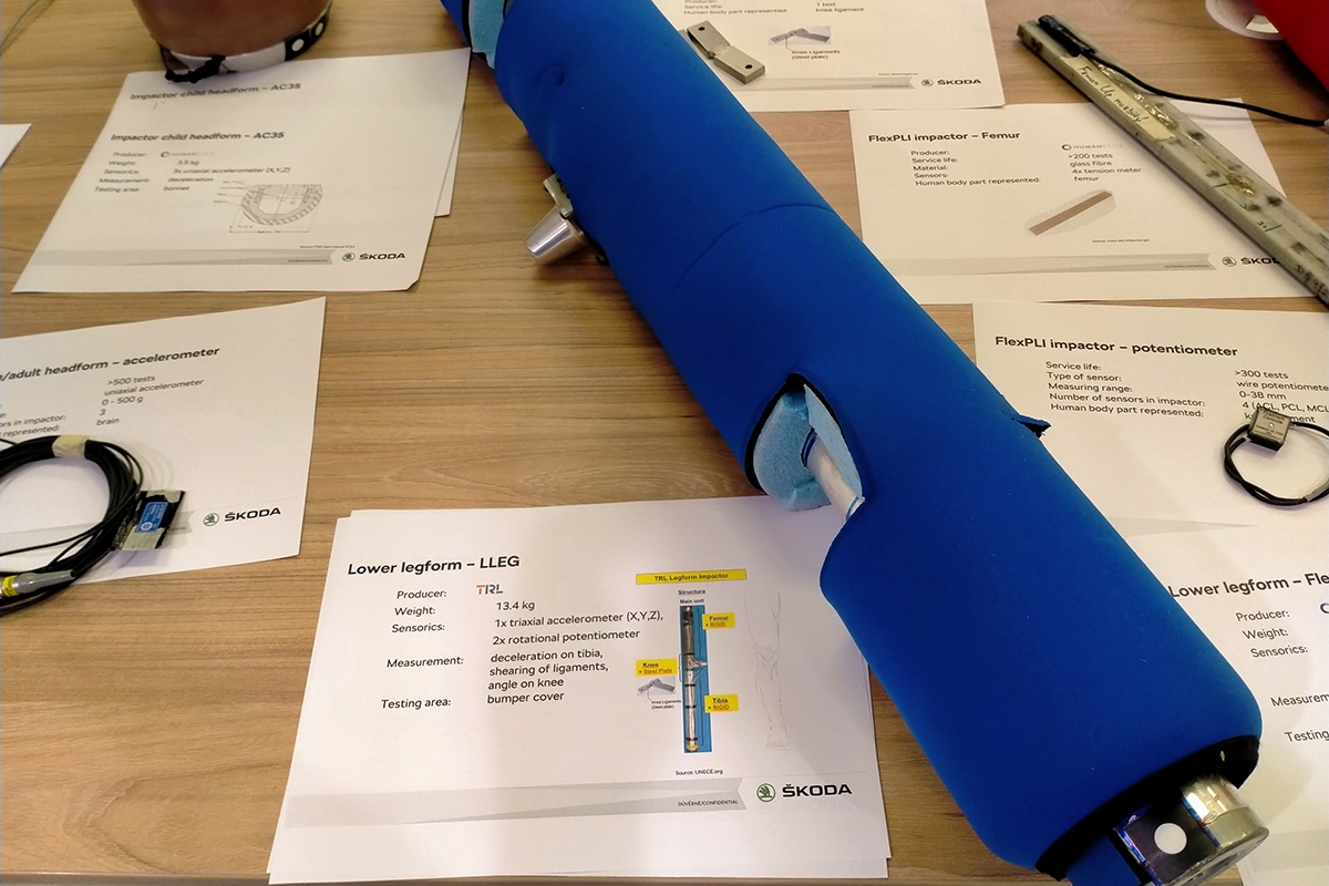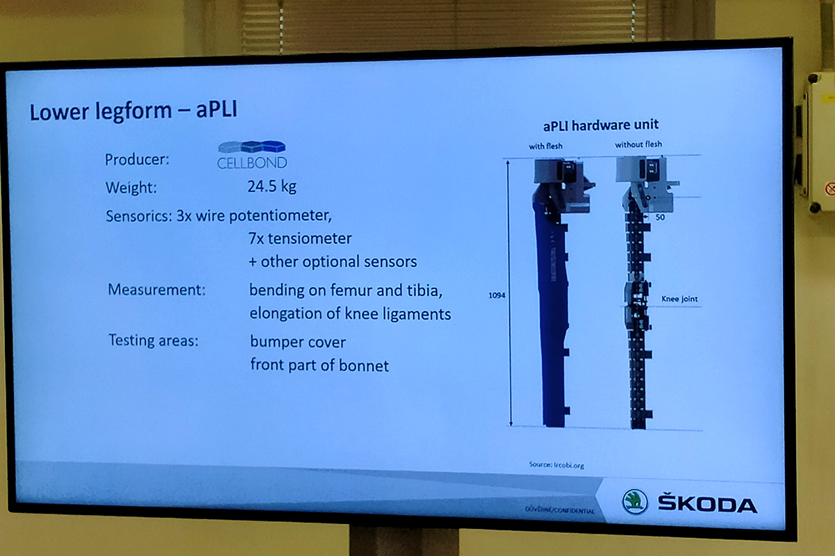 En la prueba de atropello de peatones, se utiliza una pieza que está compuesta por dos partes rígidas con una resistencia parecida al hueso humano (fémur y tibia), unidas por una más débil que simula una rodilla y sus ligamentos. La elongación de estos ligamentos se mide mediante unos potenciómetros de cable y, anteriormente, mediante una especie de pletinas que se doblaban más o menos en función de la fuerza del impacto.