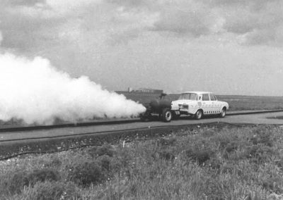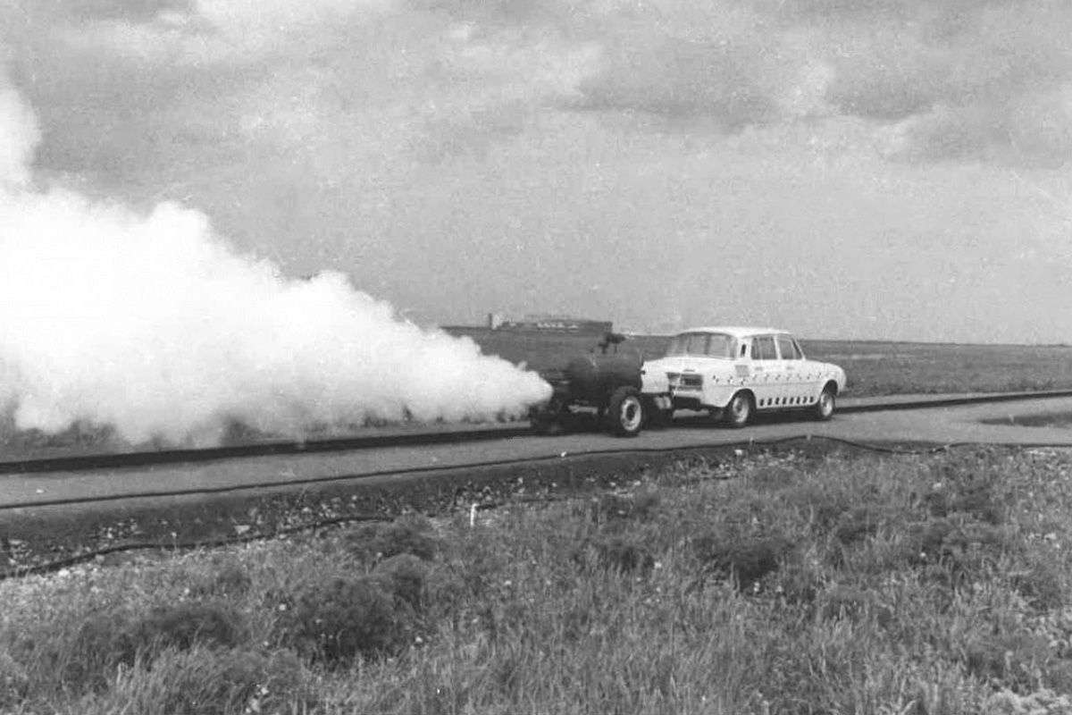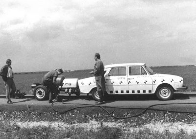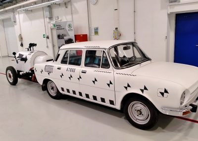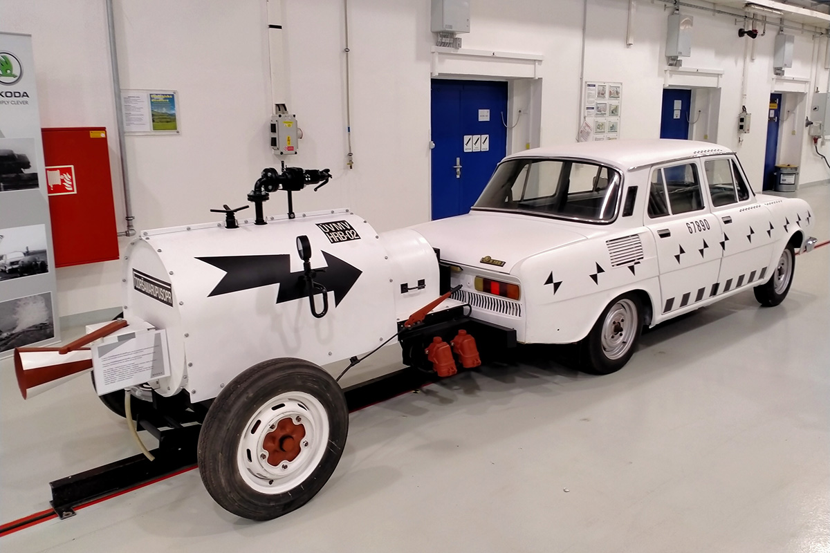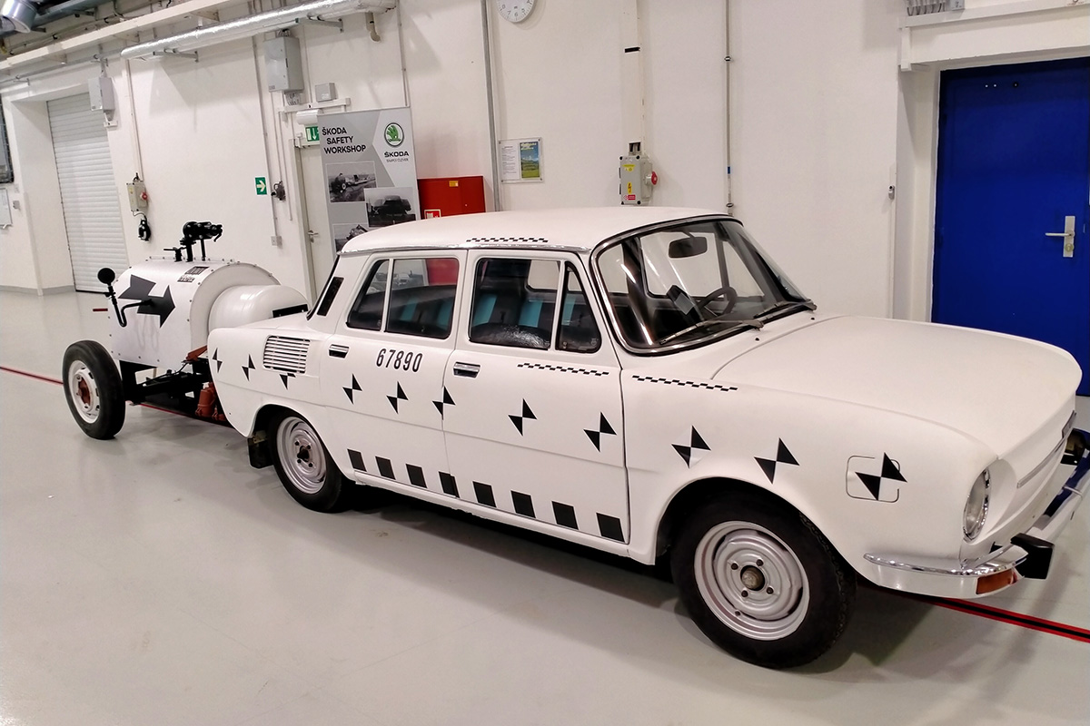 Pero no siempre fue así. Las primeras pruebas de impacto oficiales de Škoda de las que hay registros fueron en 1972 (la marca dice que las primeras podrían haber tenido lugar ya en 1968). Škoda quería vender su modelo 100L en Europa occidental, donde era obligatorio cumplir con una normativa de seguridad (no era necesario en Checoslovaquia). Las pruebas se llevaron a cabo en una zona de la pista de aterrizaje del aeropuerto Václav Havel. ¿Y cómo se aceleró el coche hasta los 50 kilómetros por hora a los que se quería impactar ese Škoda 100L?. Pues adosando a su parte posterior una especie de carretilla de dos ruedas que albergaba una caldera de vapor. El agua era calentada por unas resistencias eléctricas. Cuando se transformaba en vapor y alcanzaba una gran presión, se liberaba por la tobera que impulsaba al vehículo. Esta especie de carretilla-cohete se desconectaba del coche antes del impacto.