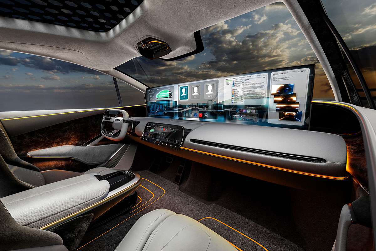 Hay una pantalla que ocupa todo el ancho del salpicadero. En marcha, esta se sitúa en su posición más baja para que el conductor pueda ver correctamente la carretera y los extremos laterales de la pantalla sirven como espejos retrovisores. A coche parado, la pantalla se puede extender hacia arriba y es cuando el interior se puede transformar en una pequeña sala de cine o en una oficina.
