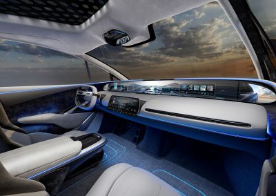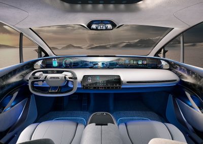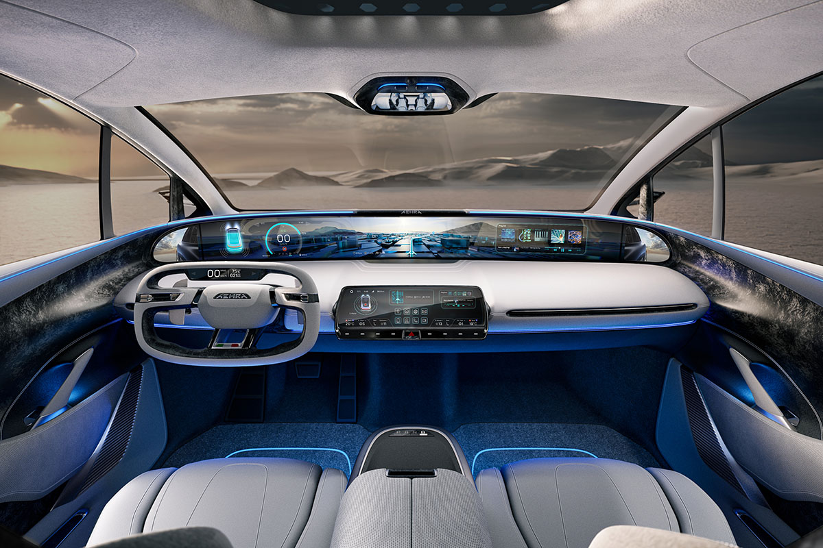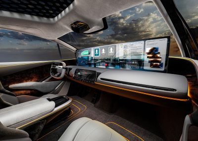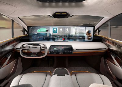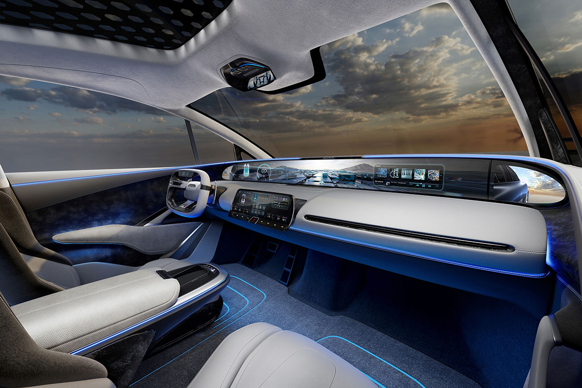 Hay una pantalla que ocupa todo el ancho del salpicadero. En marcha, esta se sitúa en su posición más baja para que el conductor pueda ver correctamente la carretera y los extremos laterales de la pantalla sirven como espejos retrovisores. A coche parado, la pantalla se puede extender hacia arriba y es cuando el interior se puede transformar en una pequeña sala de cine o en una oficina.