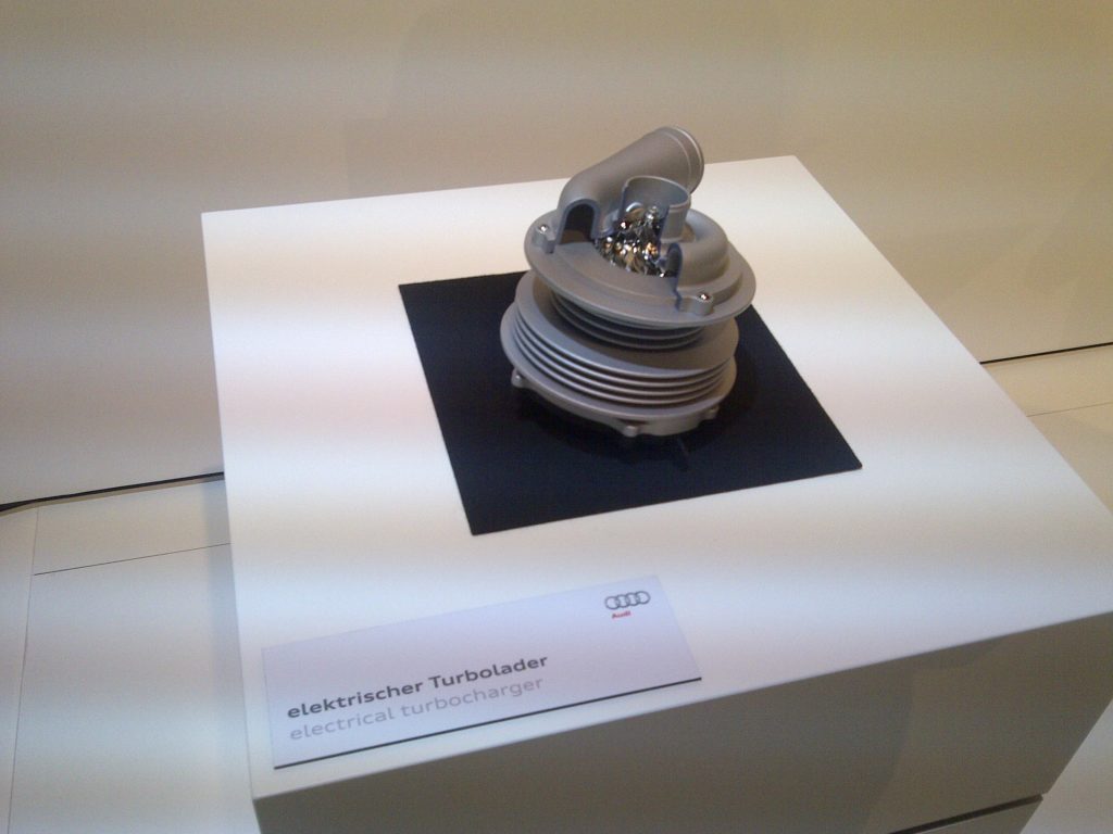 Y sí, en la foto Audi lo llama «turbocompresor eléctrico», pero no hay turbina alguna movida por gases. El funcionamiento es el siguiente. Normalmente el aire entra por la admisión y pasa por un turbocompresor normal, comprimiéndose; de ahí va a al intercooler donde es enfriado y, a su salida, se encuentra con una válvula que lo envía al colector de admisión. Pero cuando la presión de los gases de escape es insuficiente para acelerar el turbocompresor (a bajas revoluciones) , la válvula anterior desvía los gases hacia un segundo compresor accionado mediante un motor eléctrico cuya salida va conectada al colector de admisión (más abajo hay un vídeo). El motor eléctrico es capaz de acelerarlo de forma inmediata, consiguiendo un aumento de la potencia y el par.