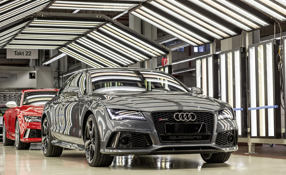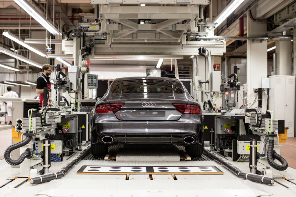 En la visita a la fábrica vi la zona donde se terminaban de montar los RS. Lo poco que vi se hacia a mano. Nos contaron que todos los modelos RS son probados en la calle durante unos 40 km, así que es imposible comprar un RS con cero kilómetros. También vi coches misteriosos tapados con lonas y coches con las características pegatinas para camuflarlos. Obviamente no pude hacer fotos. Sí puedo compartir con ustedes unas que nos ha dado Audi del proceso de contrucción del RS 7.