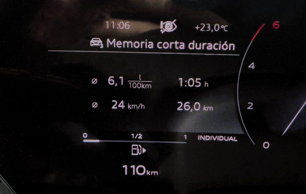 Tras 26,0 km, el ordenador marcaba un consumo de 6,3 l/100 km (6,1 l/100 km antes de corregir el error del medidor). No es un consumo alto, pero tampoco destaca por bajo. Un coche híbrido de gasolina gasta menos en este mismo trayecto (el Honda CR-V e.HEV no llegó a los cinco litros).