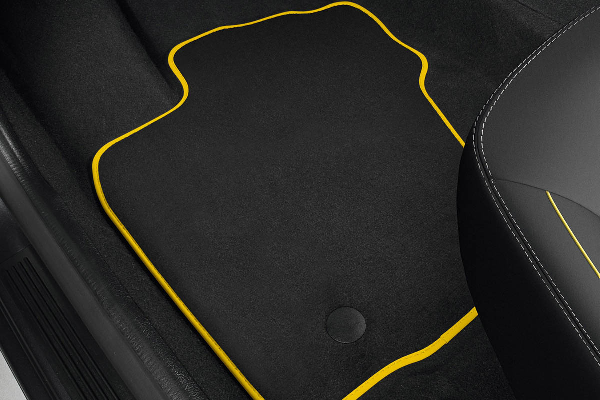 En el habitáculo también podemos ver la misma decoración que en la carrocería. El volante incorpora unos adhesivos que identifican al modelo. Los asientos están tapizados en tela con un diseño específico en el que destacamos, las inserciones en color amarillo así como el logotipo de la versión bordado en los respaldos. Otras diferencias que podemos observar son ciertos elementos pintados en «negro nacarado» —como los tiradores de las puertas y el borde de la consola central— o las alfombrillas con diseño específico.