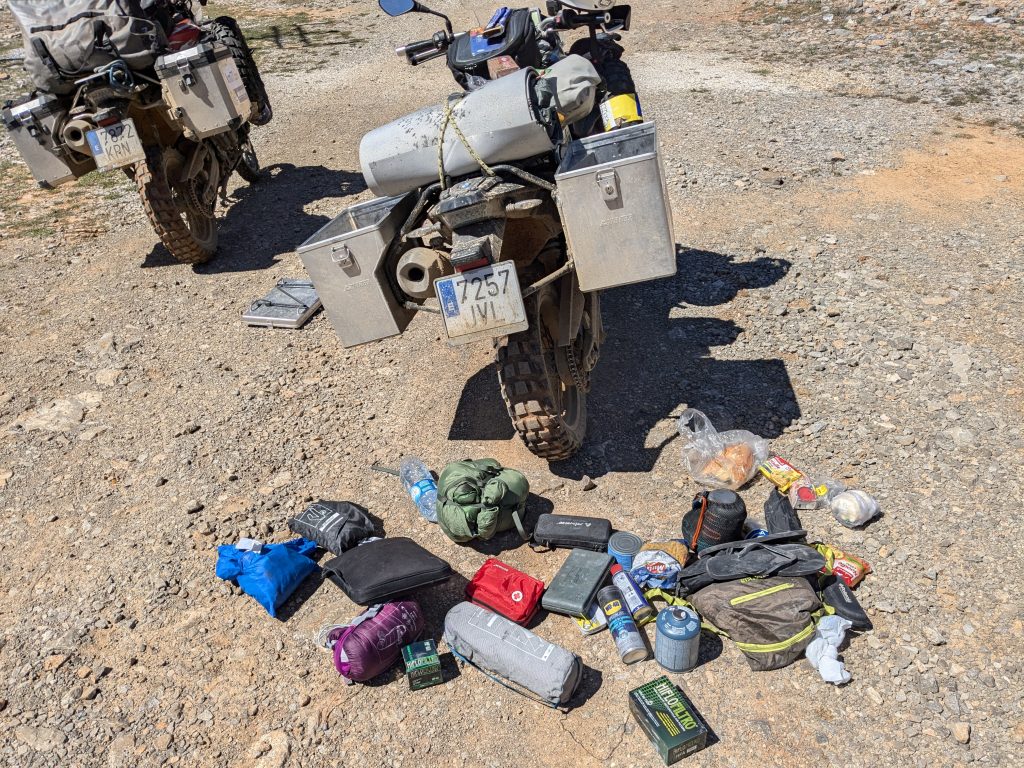Pastillas de freno, filtros de aire y aceite, un litro de aceite de motor, retenes de horquilla delantera, rodamientos de ruedas y dirección, y un kit de transmisión. Nos planteamos llevar un juego de discos de embrague, pero nos parece poco probable que nos haga falta. Y, muy importante: cada uno llevamos un neumático trasero extra, colgado en las barras protectoras del carenado. (Nos hará falta, seguro; lo que no sabemos es dónde necesitaremos montarlo).
