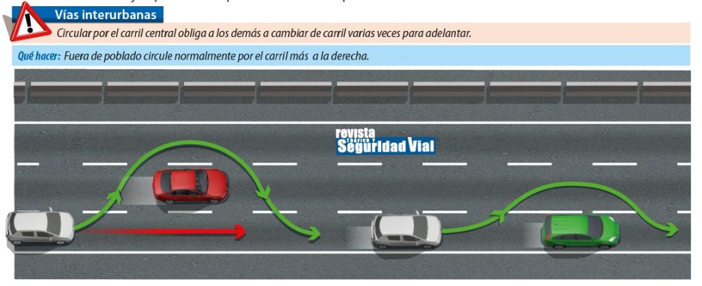 Cuando un vehículo circula sin motivo por el carril central, obliga a otros conductores que desean mantener una velocidad superior a realizar varios cambios de carril para poder adelantar, ya que en España no está permitido adelantar por la derecha. Esto multiplica las maniobras y, por tanto, el riesgo de accidentes por colisiones laterales o por alcance.