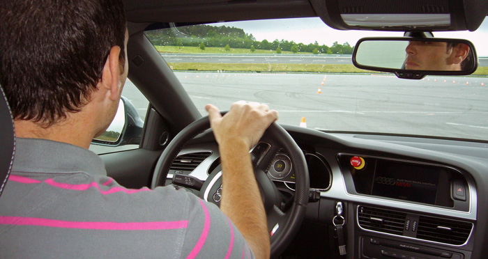 No os puedo decir a qué se refería con esas programaciones a pesar que le pregunté por ello. La suspensión no era variable así que no tengo claro el porqué hizo esas referencias. Pero, sea lo que sea…. ¡madre mía!, ¡cómo iba en el «modo Ferrari»! Si el ESP fue revolucionario porque es como tener cuatro pedales de freno, uno para cada rueda, accionados por un conductor con cuatro piernas, conducir este Audi es como tener cuatro pedales del acelerador, ya que variando la fuerza que hace cada rueda es posible actuar sobre la trayectoria instantáneamente y de forma continua. El A5 entraba entre cono y cono con una facilidad increíble, cambiaba de apoyo sin subviraje ni sobreviraje. Si así van a ir los coches en el futuro va a ser increíble las velocidades de paso por curva que se lograrán.