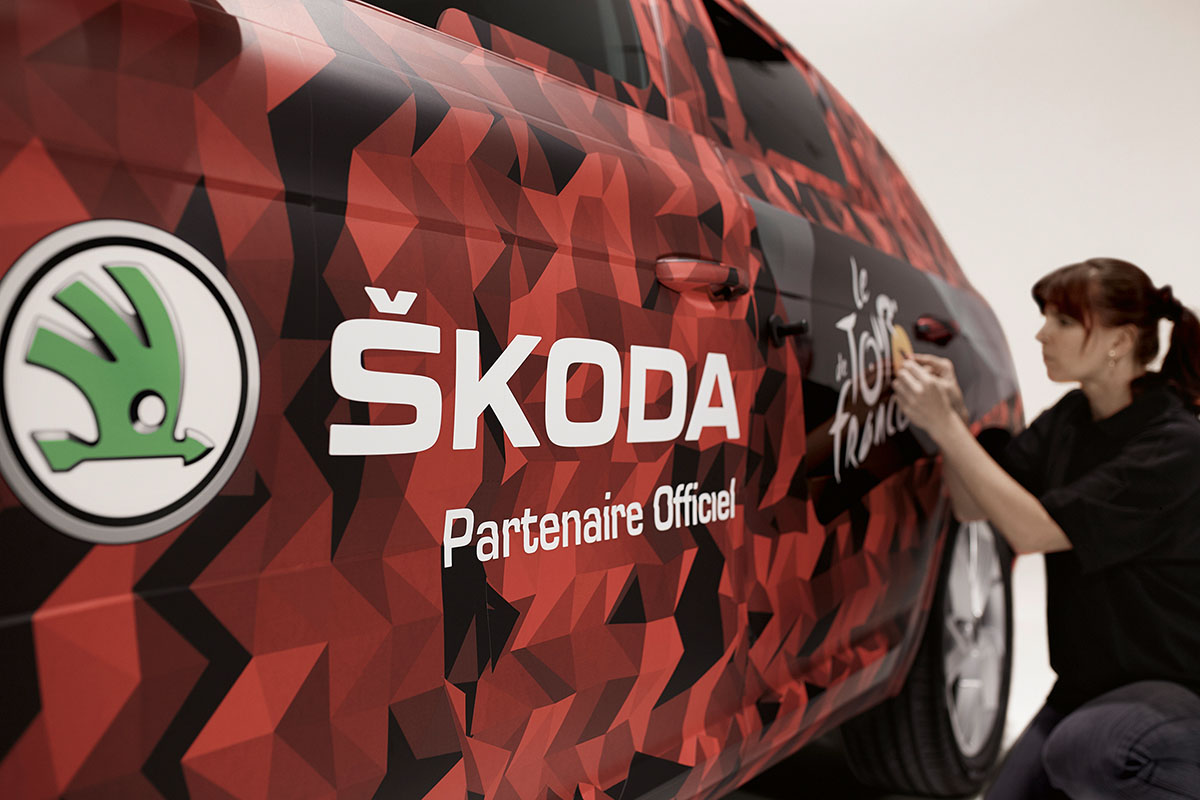 El nuevo revestimiento ha sido colocado por cuatro especialistas que han empleado cerca de 21m² de láminas y lo han hecho en 120 horas de trabajo. Actualmente, y debido al patrocinio de Škoda en el Tour (desde hace 13 años), el «Coche Rojo», que actúa como centro de control móvil de la carrera y es utilizado por el director de la misma, Christian Prudhomme, es un Škoda Superb.