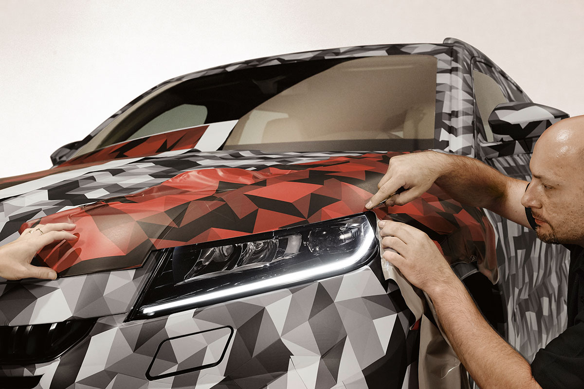 Pero no conoceremos todavía su aspecto final, el Kodiaq, que será conducido por Stephen Roche —ganador del Tour en 1987 y actualmente embajador de la marca—, tendrá, al igual que las primeras fotos oficiales, unos vinilos en forma de camuflaje. Aunque esta vez, la combinación blanco, gris y negro será sustituida por una roja, gris y negro. Según Škoda este nuevo camuflaje «está inspirado por el nuevo lenguaje de diseño y se presenta junto a elementos tridimensionales diseñados y fabricados exclusivamente para esta aparición especial. Cerca de 14 000 pequeñas piezas colocadas en el vehículo insinúan los contornos y el carácter del SUV de Škoda».