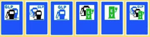 Este último grupo de señales representan la existencia de diversos tipos carburante así como puntos de recarga para coches eléctricos.